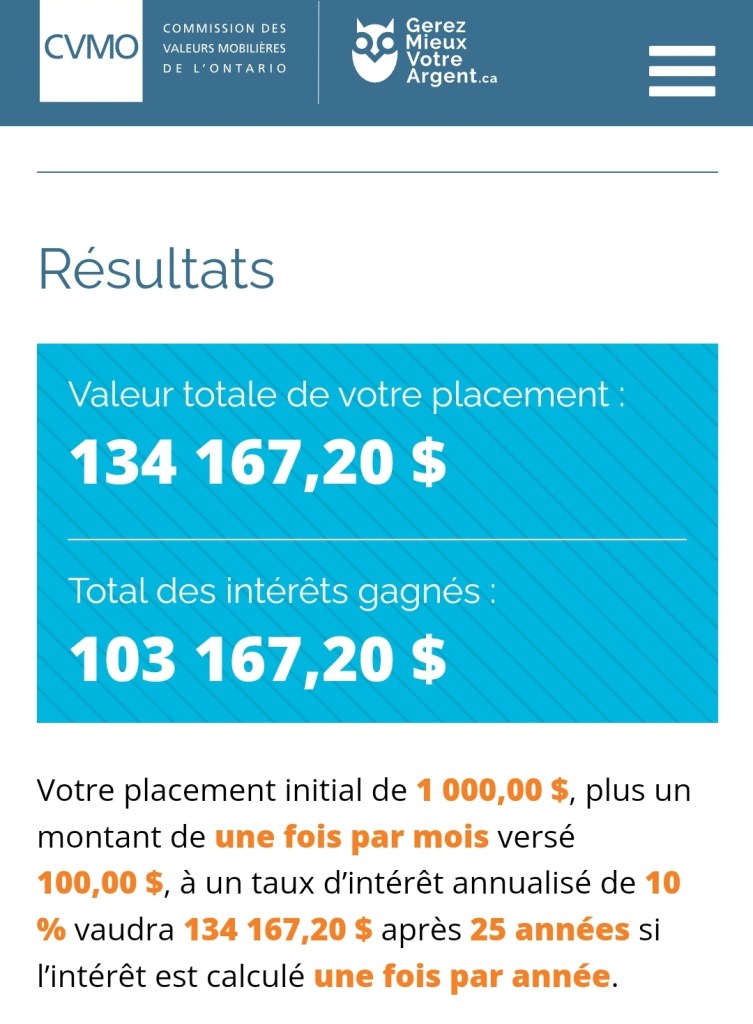 Pour ce faire nous allons utiliser les intérêts composés, c’est très simple imaginons que tu places nos fameux 1000 euros en bourse avec un rendement annuel moyen de 10% et en plaçant régulièrement 100 euros par mois. Sur 25 ans tu auras donc placé 31000 euros en bourse. Maintenant regarde le résultat 😱